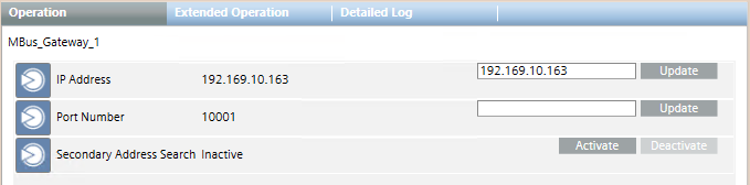 In the Operation tab, do the following: a.(Optional) Next to the IP Address property, modify the gateway IP address and click Update. The IP Address property updates and displays its setting. b.(Optional) Next to the Port Number property, modify the gateway port number and click Update. The Port Number property updates and displays its setting. c. Next to the Secondary Address Search property, click Activate to enable a secondary address search on the device.