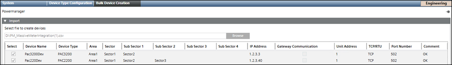 - A success message displays on successful creation of the devices. The selected devices are created and displayed in the System Browser tree according to the structure defined in the CSV file.