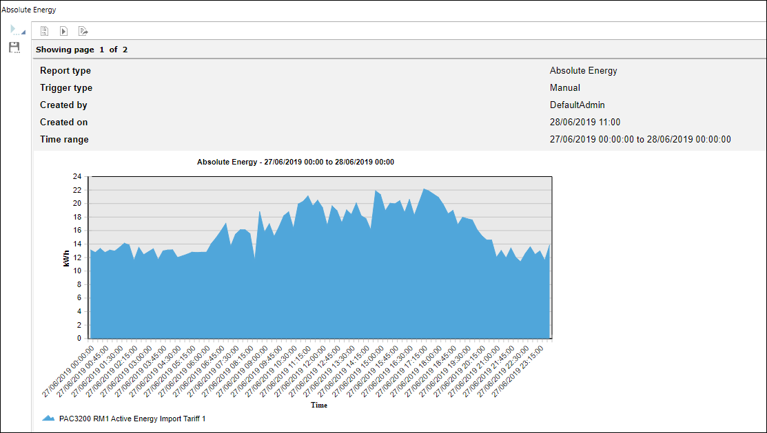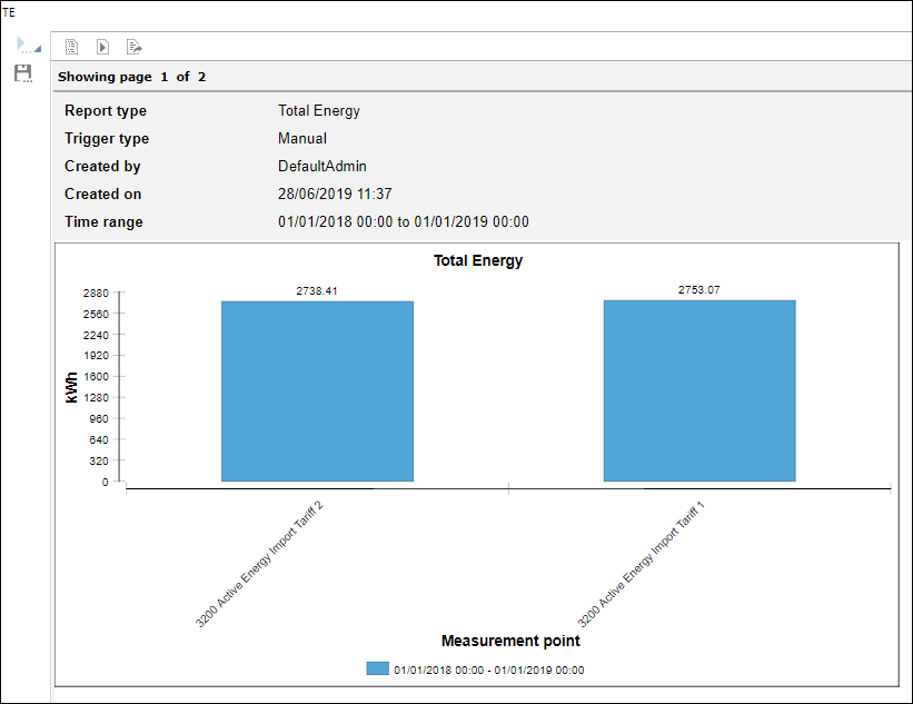 This report displays the total energy consumption of a selected data point for the selected time period. The data can be displayed as a bar chart or a pie chart.