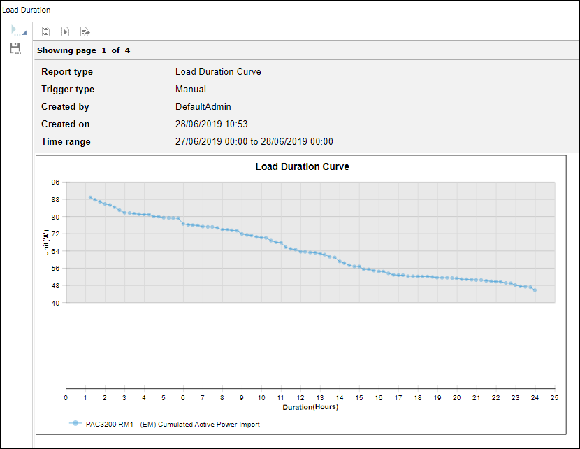 This report displays the power demand values and the duration of each power demand value used in the selected time period. It displays a detailed view of the 50 highest power demand values of the selected time interval and an analysis of these values over the day.