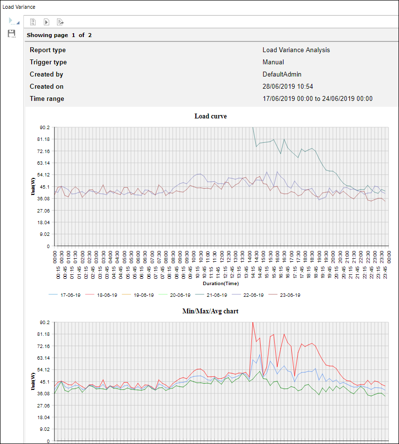 This report shows the power demand values for the selected time period and shows the range of the power demand values for each time. On this basis, it displays the variance of the load for a certain time period.