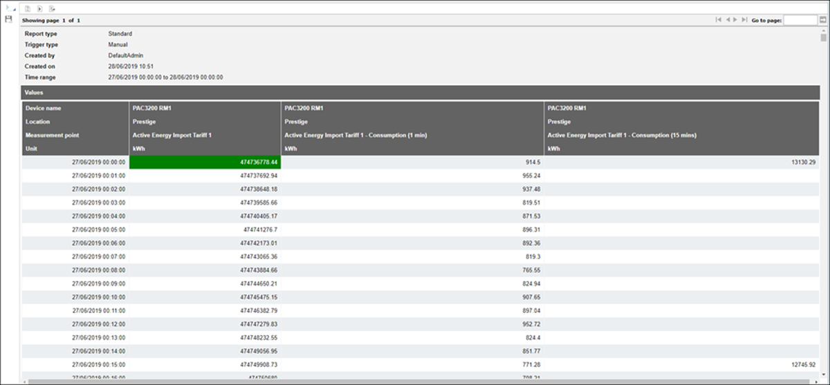 This report can be used for any powermanager measuring value that is archived. This report displays all the values of the selected data points for a selected time period in a table.