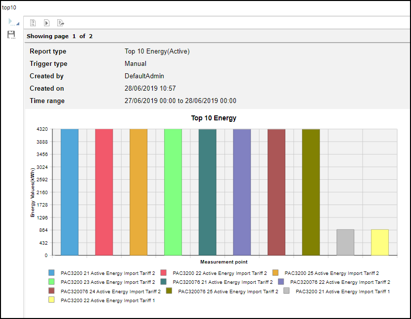 The Top 10 energy report displays the details of the top 10 consumers of the active energy and reactive energy across the powermanager system.