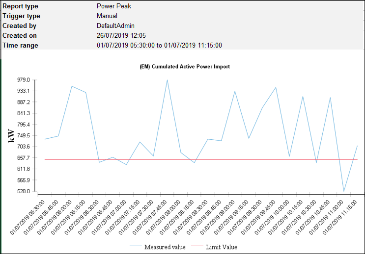 Powermanager contains a report generator for determining power peaks within a specified time range. You can evaluate the following values using the report generator: