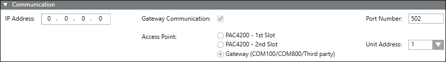 Gateway Communication: By default, this check box is selected, setting the Access Point to the Gateway (COM100/COM800/Powercenter 3000/ThirdParty).