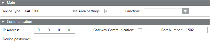 The fields displayed in the Communicaton expander vary according to the selected device type.