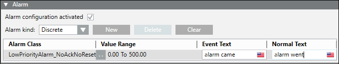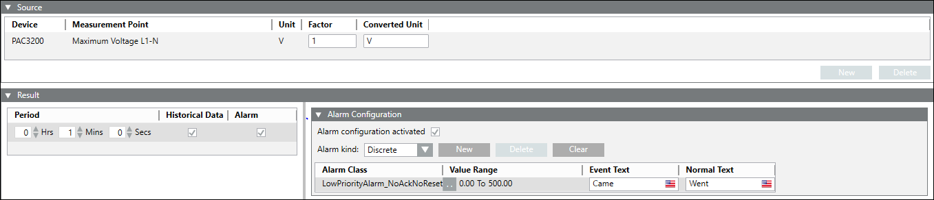 Alarm configuration activated: Select this check box to activate the alarm for the corresponding measuring point.