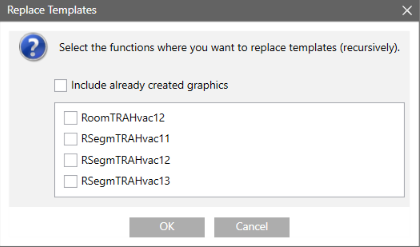 Select the check box for the template to be replaced. Note: Only room and segments are displayed that fulfill the following conditions: - A function is assigned to the data point - A template is assigned to the function - The room mapping graphic is available (MAP_FUNCTION_XXXX_) - A function with prefix _NT is available for the room mapping graphic.