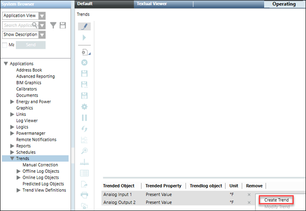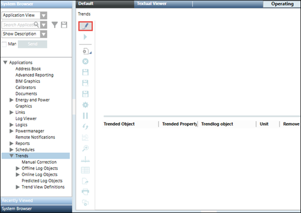 BACnet points to be added to the trend log objects display in the Trend Viewer and the Trend Viewer is in Edit mode. For more information, see Add BACnet points to the Trend Viewer.