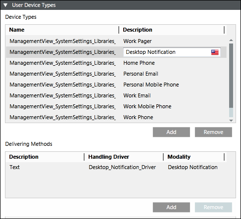 - The user device type is automatically configured. In the Recipient Editor tab, under the User Device Types expander, you can see that the Desktop Notification Driver is set as the handling driver and modality is set as Desktop Notification.