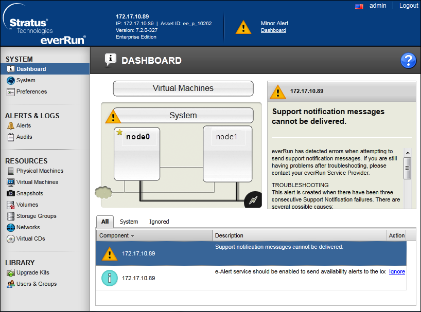 See the Managing Local User Accounts section of the everRun’s User’s Guide. The DASHBOARD of the everRun Availability Console displays node0.