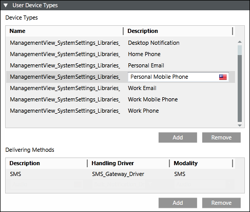 The user device type is automatically configured. In the Recipient Editor tab, under the User Device Types expander, you can see that the SMS Gateway Driver is set as the handling driver and modality is set as SMS.