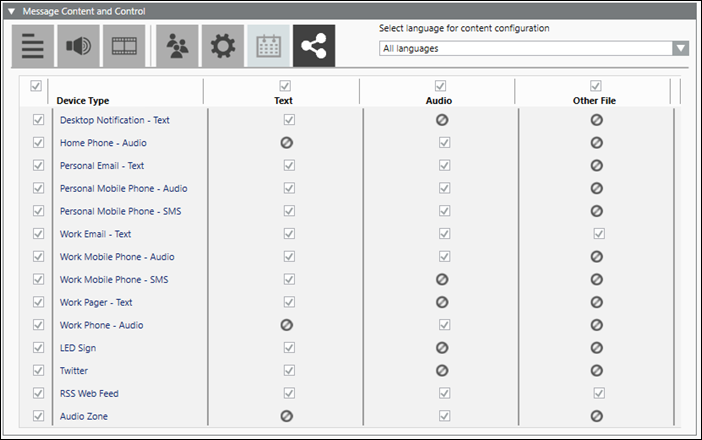 - Text: Displays the text processing capability of the corresponding device. A check box is displayed for a device in this column if the corresponding device is capable of processing text.