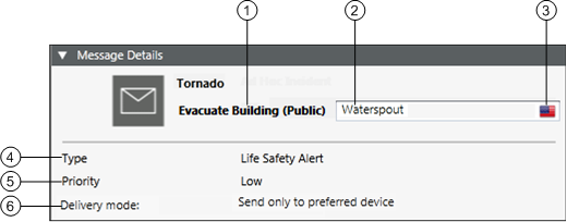 2 | Additional details | Allows the user to type in the language-specific additional details for the live announcement. For example, Tornado in South Sea. |