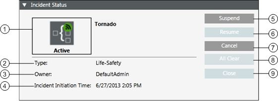 6 | Status | Displays the icons for the incident state and the pending live announcements associated with the corresponding incident template. For example:
