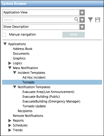 - Notification template: For message templates that are part of an incident template, this field allows users to select a targeted notification template from the drop-down list. Alternatively, the user can drag a stand-alone notification template from the System Browser hierarchy to configure the targeted notification template.
