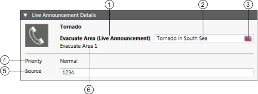 1 | Selected live announcement template | Displays the selected live announcement template. For example, Evacuate Area (Live Announcement). |