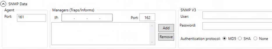 In the Managers (Traps/Informs) panel, specify the list of managers that will notify the SNMP agent: a. Enter the manager IP. b. Enter Port on which all traps will be notified (default port is 162). c. Repeat the previous steps and click Add to add all the required managers. NOTE: If you do not set the IP manager, the manager of the local station will be considered. If you want to set multiple IP managers, remember to include in the list also the manager of the local station. To remove any unwanted manager, select it in the list and click Remove.