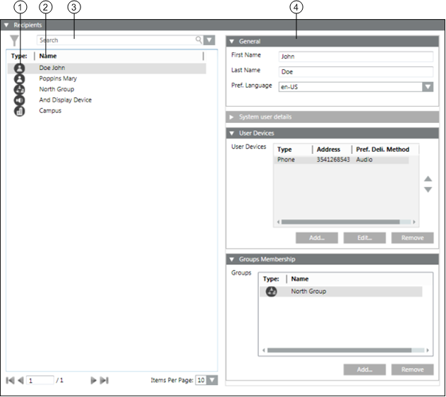 13 | Recipient user devices | Displays the list of user devices for the selected recipient user. Each user device configuration consists of device type, address, and the preferred delivery method. |