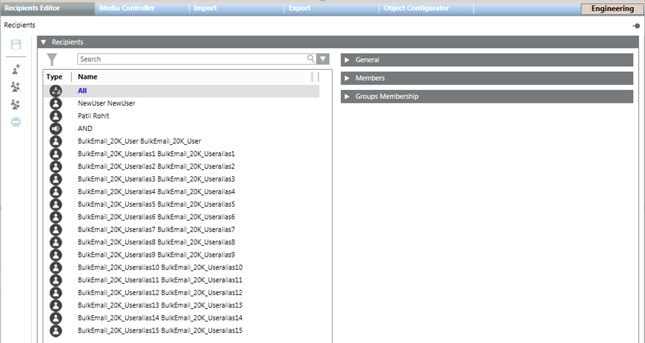 In the System Browser, when you select Applications > Notification > Recipients, the Recipients Editor tab displays, allowing you to configure recipients, recipient group and so on using the following expanders along with the toolbar controls listed below:
