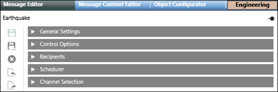 In the System Browser, when you select Applications > Notification > Notification Templates, the Message Editor tab displays allowing you to configure messages using the following expanders along with the toolbar controls listed below: