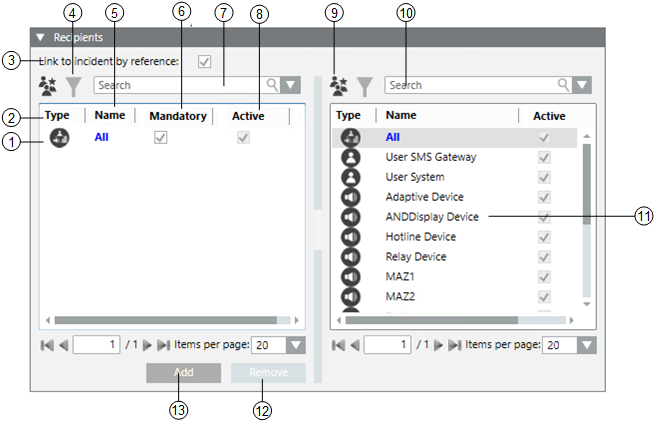 6 | Mandatory | Select this check box to make the recipient a mandatory recipient of the message or live announcement that cannot be unselected during a message or live announcement launch. |