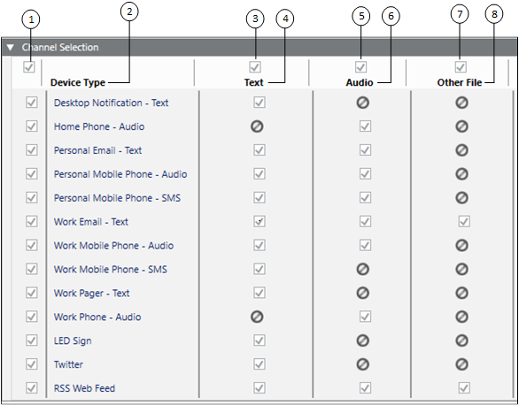 4 | Text | Displays whether the corresponding device supports text as a Delivery Method. A check box is displayed if the device is capable of processing text. |