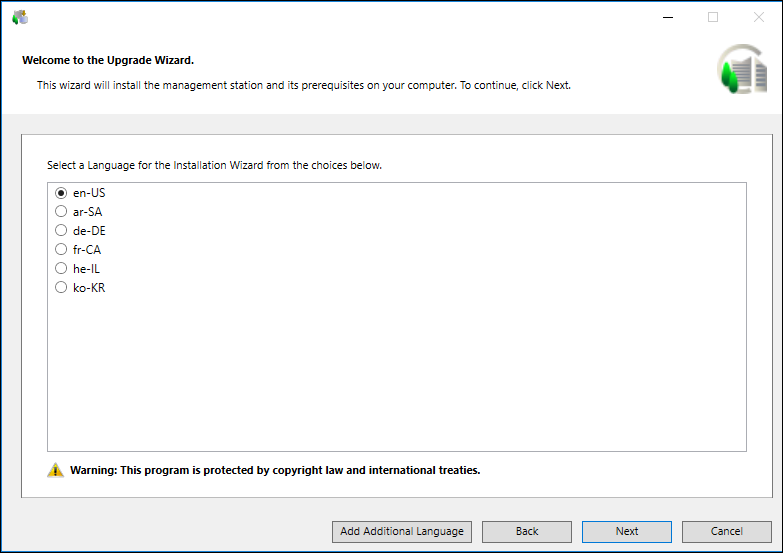 - By default, the installation language configured in the GMS Platform.xml file is used for installation. However, if the language pack is invalid or not found on the distribution media, then the Welcome to the Desigo CC Upgrade Wizard dialog box displays, with the default selection as the en-US language or the current OS language. It also lists all the languages whose language packs are valid and available at the path