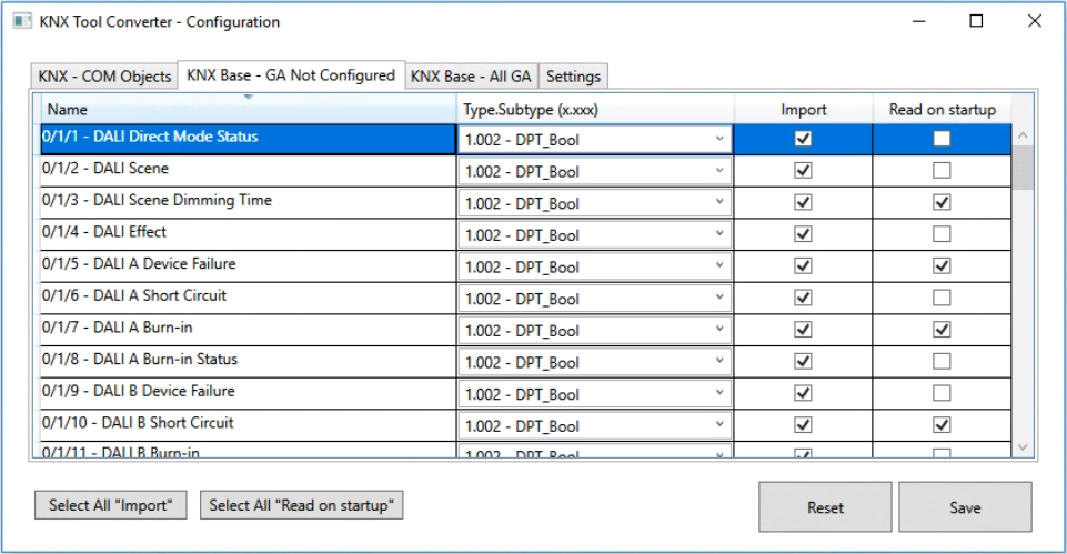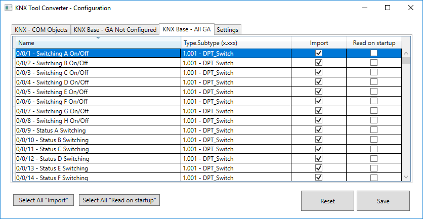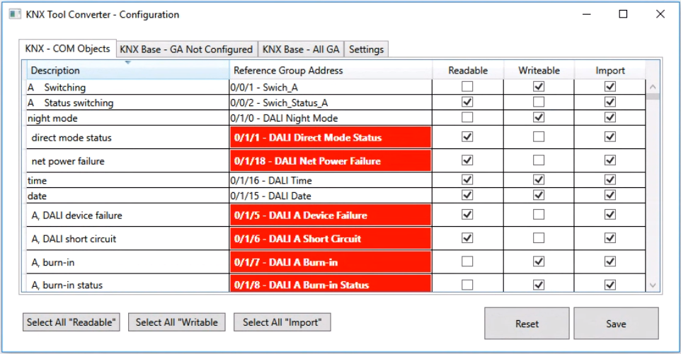 NOTE: To set to readable all the KNX COM objects included in the configuration file, click Select All “Readable”.