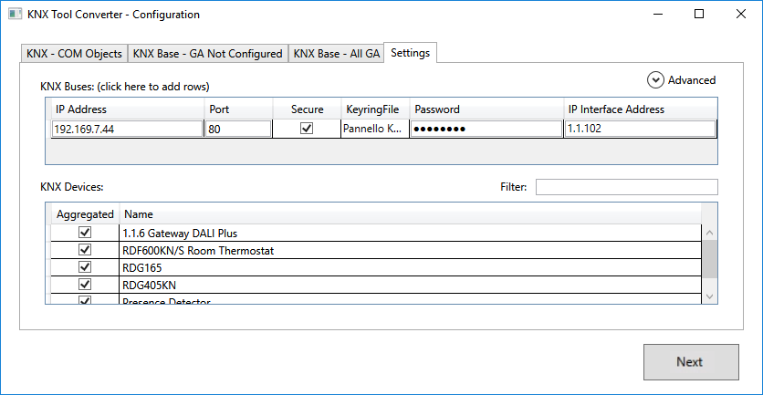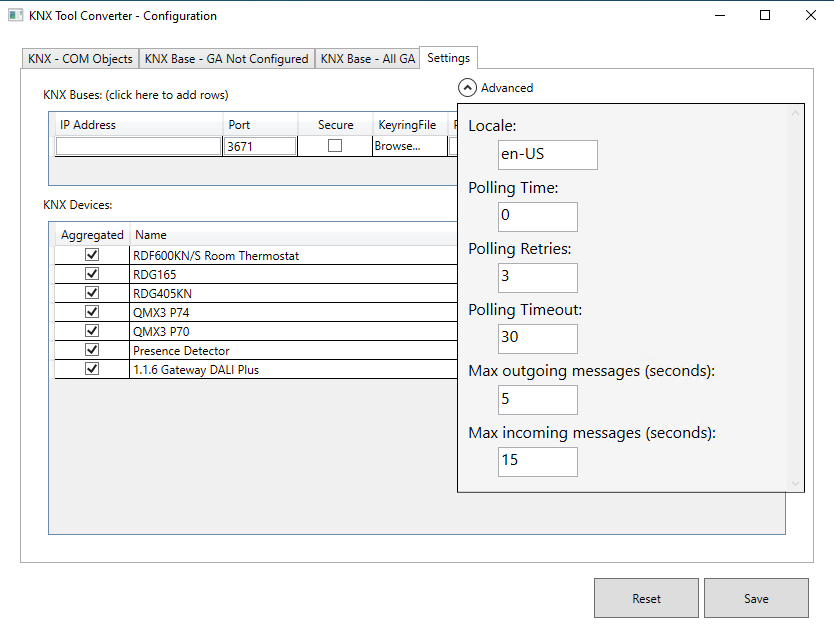 - The KNXTool Converter – Configuration window is open to the Settings tab.