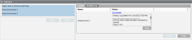 New+ | A BACnet object only has one intrinsic alarm. Clicking the New button lets you create a new event enrollment object. Since you cannot delete an intrinsic alarm, the Delete button is unavailable. |