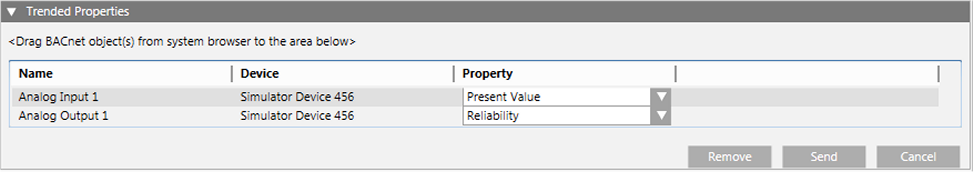 With Trend Log Multiple, you can add the same object more than once to collect different properties. For example, you can add Analog Input 1 twice, specifying Present Value in the first instance and Status Flags in the second.