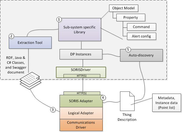 - The SORIS adapter contains the Thing Descriptions, which contain the Object Models. The SORIS driver communicates with the SORIS adapter to get the Thing Descriptions, and then an auto-discovery component in Desigo CC makes the instances of the Object Model(s) and addresses the properties with resource URLs. Then, the SORIS driver starts to read and update the resources.
