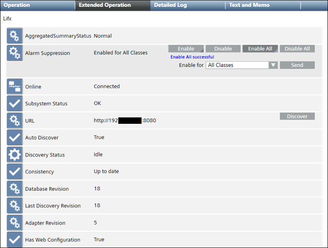 At this point, you need to rediscover the object to re-synchronize the adapter and the management station. Once the thingAdapter object is discovered, the Consistency property in Extended Operations reads Up to date, the system removes the alarm from the Event List, and the Activity Log records the transaction.