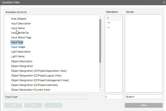 Right-click the report definition and select Filter and Condition Filters. a. In Available columns, select the option Input Type. b. In Condition, select the option =. c. In Values, enter the option "Button". d. Click Add. e. Click OK.