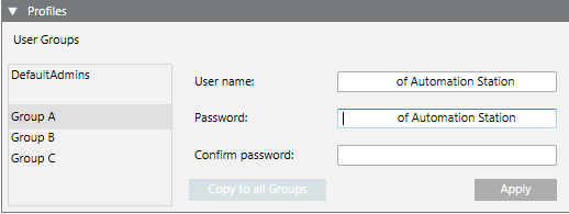| User Groups One password can be defined for each user group per Desigo automation station. The password must be entered when connecting to the Setup and Service Assistant if passwords differ on the network. In the event of multiple passwords, we recommend using the password that is used on most Desigo automation stations. | |