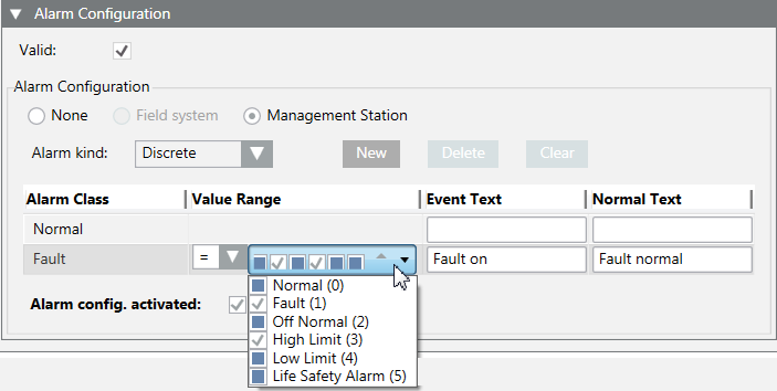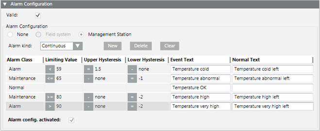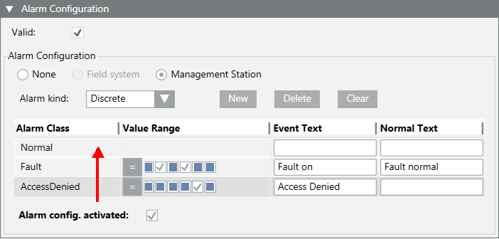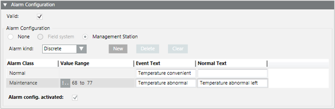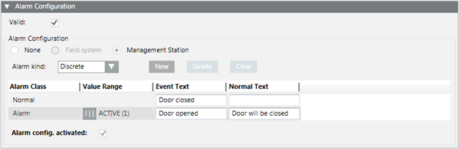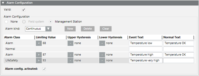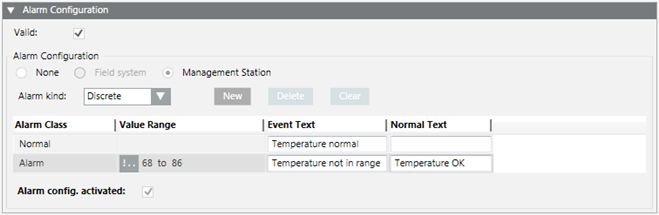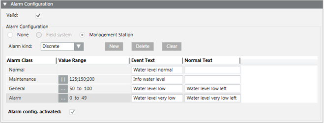 - In the Alarm Configuration expander, select Valid. The activation is displayed in gray.