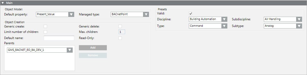 Once you have an object model available at your customization level--whether a new one or a copy of an existing one--you can begin to configure or edit its settings. The main expander contains some important settings for the object model, including its presets for object classification, and rules defining how child objects are created.