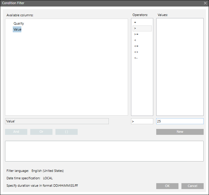 a. Right-click the Trends table, and select Filters > Condition Filter. The Condition Filter dialog box displays. The Condition Filter is applied on either Value or Quality column.
