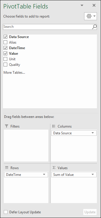 - (Optional) To export the output of report in the Excel format, and to perform additional processing on the trend data while generating an Excel document from the Trends report, for example, in the excel output of a Trends report, if you want to have Data Source (such as, trendlog) as columns, then you can configure Excel template with the report using the PivotTable. For more information, see Viewing a Report Definition in the Excel format with a Template. For above example, configure the PivotTable fields as displayed in the following image.