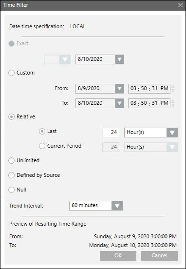 - Time filter is used to fetch trends for a specific time range, and at specified intervals. If you want to view the records for a specific duration, select the appropriate date/time values in the Exact, Custom or Relative options. You can also select a Trend Interval, to retrieve a single record for every ‘x’ period. For example, to view records for the last 24-hours, where each record is retrieved for every 60 minutes interval, perform the following steps, and add the Time Filter.