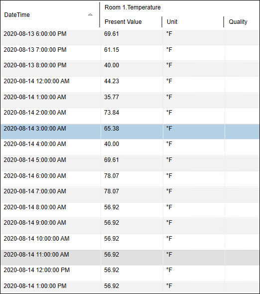 - The report displays the data for the trend log object where the temperature value is greater than 25-degree in the last 24-hours, and there is an interval of 60 minutes, between records. When a trend interval is selected in the Time Filter dialog box, then Trends table will not display all the values that are present in the selected time duration. The data displays in the report for only the time stamps, which are according to the interval specified in the Time Filter dialog box.